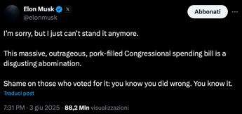 Musk: la politica interna di Trump ci porterà alla bancarotta