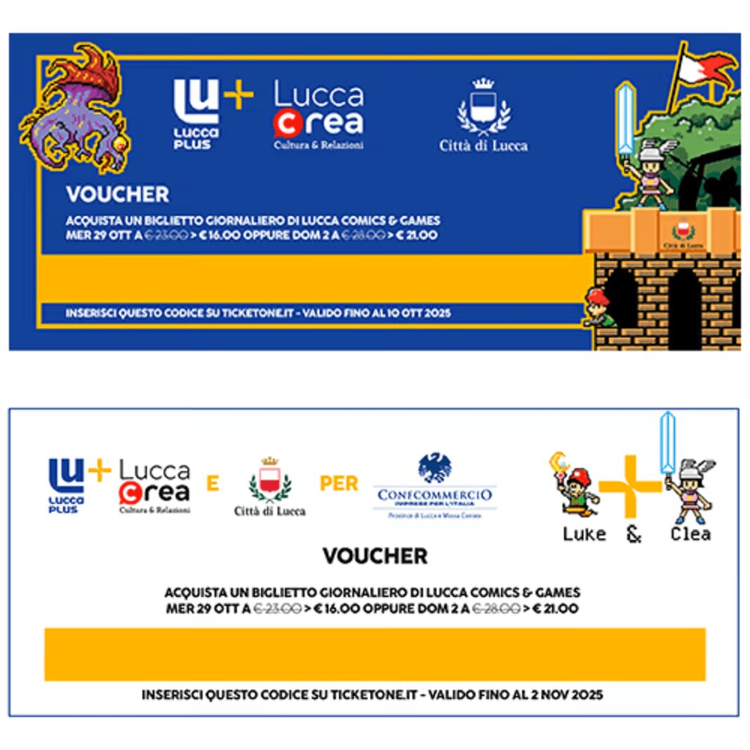 Lucca Crea, con il Comune di Lucca e Lucca Plus, realizzerà 10.000 voucher con uno sconto di 7€ per il primo e ultimo giorno di manifestazione per i residenti del Comune di Lucca. La promozione poi proseguirà in collaborazione con Confcommercio nella settimana successiva all’inaugurazione delle mostre di Palazzo Guinigi. Saranno disponibili cartoline con codici sconto che verranno distribuite sul territorio a settembre da Lucca Plus e in ottobre dagli esercenti che aderiranno al progetto.