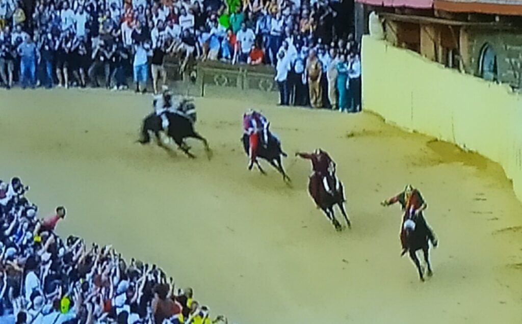 Cavalli che, aggiungiamo noi, come le immagini della diretta di La7 hanno messo ben in evidenza, hanno corso spinti da un’infinità di frustate da parte dei fantini.