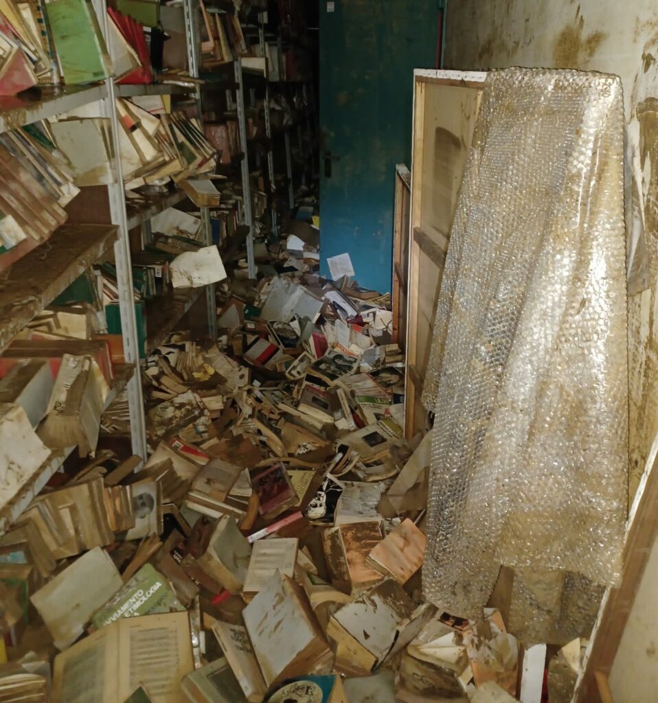 E nel fango libri e documenti della biblioteca comunale Tiziano Terzani a Villa Montalvo in una Campi Bisenzio devastata dall’alluvione. “Le bibliotecarie e il bibliotecario che in questo luogo prezioso lavorano da anni, con dedizione e passione, ringraziano per le offerte di aiuto che stanno arrivando da colleghi, editori, librai, lettori e lettrici”.