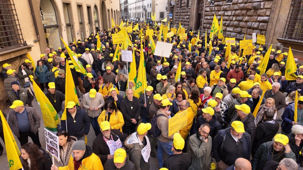 FIRENZE – L‘onda gialla dei trattori e il suono assordante dei campanacci hanno travolto stamani (25 febbraio) il cuore di Firenze. In migliaia, arrivati da ogni angolo della Toscana, si sono ritrovati sotto la sede del Consiglio regionale per lanciare un ultimatum alla politica: dodici priorità, un vero e proprio “manifesto” della sopravvivenza, da attuare entro i prossimi cento giorni.