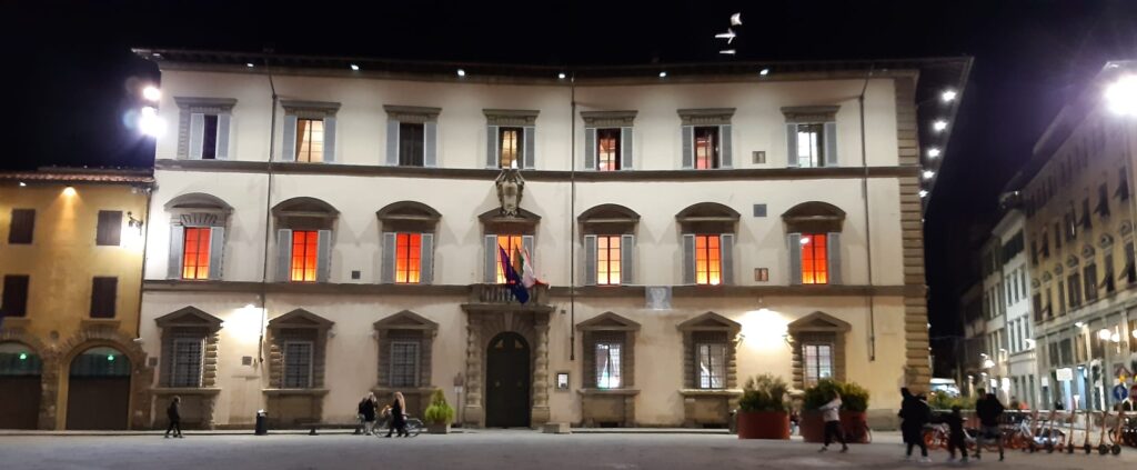 La facciata di Palazzo Strozzi Sacrati a Firenze, sede della presidenza della giunta regionale della Toscana, è illuminata di rosso.