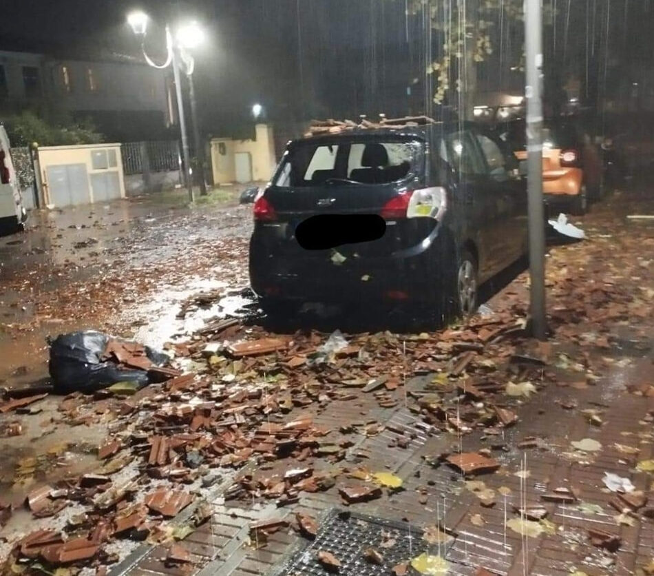 Tromba d’aria a Torre del Lago, Comune di Viareggio, con raffiche oltre i 100km/h e tetti scoperchiati lunedì 30 ottobre sera. Raffiche di tegole sulle auto.